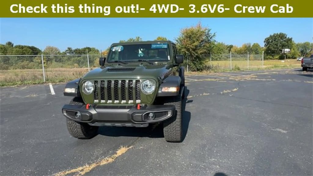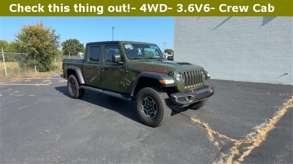 Gladiator Mojave, 4D Crew Cab, 3.6L V6 24V VVT, 8-Speed Automatic, 4WD, Sarge Green Clearcoat, Black Cloth, 240 Amp Alternator, 4-Wheel Disc Brakes, 4.10 Rear Axle Ratio, 9 Speakers, 97 MPH Vehicle Max Speed Calibration, ABS brakes, Air Conditioning, Alloy wheels, AM/FM radio: SiriusXM, Apple CarPlay/Android Auto, Auto-dimming Rear-View mirror, Automatic temperature control, Auxiliary Switch Group, Auxiliary Switches, Black 3-Piece Hard Top, Brake assist, Class IV Receiver Hitch, Cold Weather Group, Compass, Delay-off headlights, Driver door bin, Driver vanity mirror, Dual front impact airbags, Dual front side impact airbags, Electronic Stability Control, Emergency communication system, Freedom Panel Storage Bag, Front anti-roll bar, Front Bucket Seats, Front Center Armrest w/Storage, Front dual zone A/C, Front fog lights, Front License Plate Bracket, Front reading lights, Fully automatic headlights, Garage door transmitter, Heated door mirrors, Heated Front Seats, Heated Steering Wheel, Heavy Duty Suspension w/Gas Shocks, Heavy-Duty Engine Cooling, Illuminated entry, Integrated roll-over protection, Leather steering wheel, Low tire pressure warning, Navigation System, Occupant sensing airbag, Outside temperature display, Panic alarm, ParkView Rear Back-Up Camera, Passenger door bin, Passenger vanity mirror, Power door mirrors, Power steering, Power windows, Premium Cloth Seats w/Sport Bolsters, Quick Order Package 24D Mojave, Radio data system, Radio: Uconnect 4C Nav w/8.4 Display, Rear anti-roll bar, Rear reading lights, Rear Sliding Window, Rear Window Defroster, Remote keyless entry, Security system, Speed control, Split folding rear seat, Steering wheel mounted audio controls, Tachometer, Telescoping steering wheel, Tilt steering wheel, Traction control, Trailer Hitch Zoom, Trailer Tow Package, Trip computer, Variably intermittent wipers, Voltmeter. Just thought you should know...All pre-owned vehicles go through a comprehensive 126 multi point vehicle inspection. New wiper blades, New Cabin Air Filter, New engine Filter, and fresh New Oil Change, then detailed for its new owner.